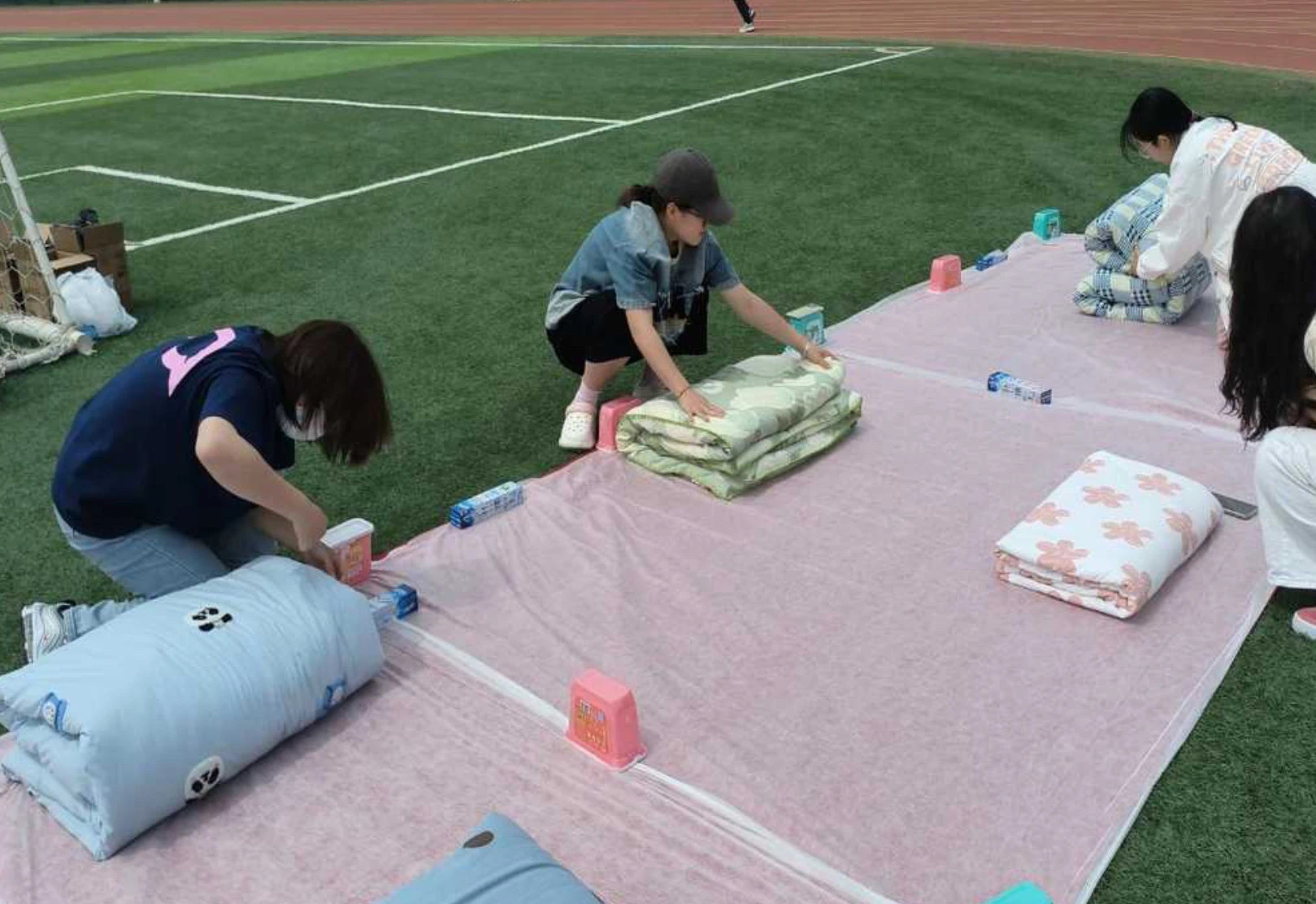 5月18日在北校足球场举办开展了现场叠被子的附加比赛,活动现场气氛热烈。比赛开始,大家迅速投入,有两位同学叠的被子棱角分明。在比赛结束后,有的叠的不太好的同学积极向叠的好的同学进行请教。这两位同学从如何铺平床单、整理边角,到如何快速折出规整形状来教其他同学。在相互帮助与学习中,原本叠得不够理想的同学,叠被子的能力也愈发熟练。